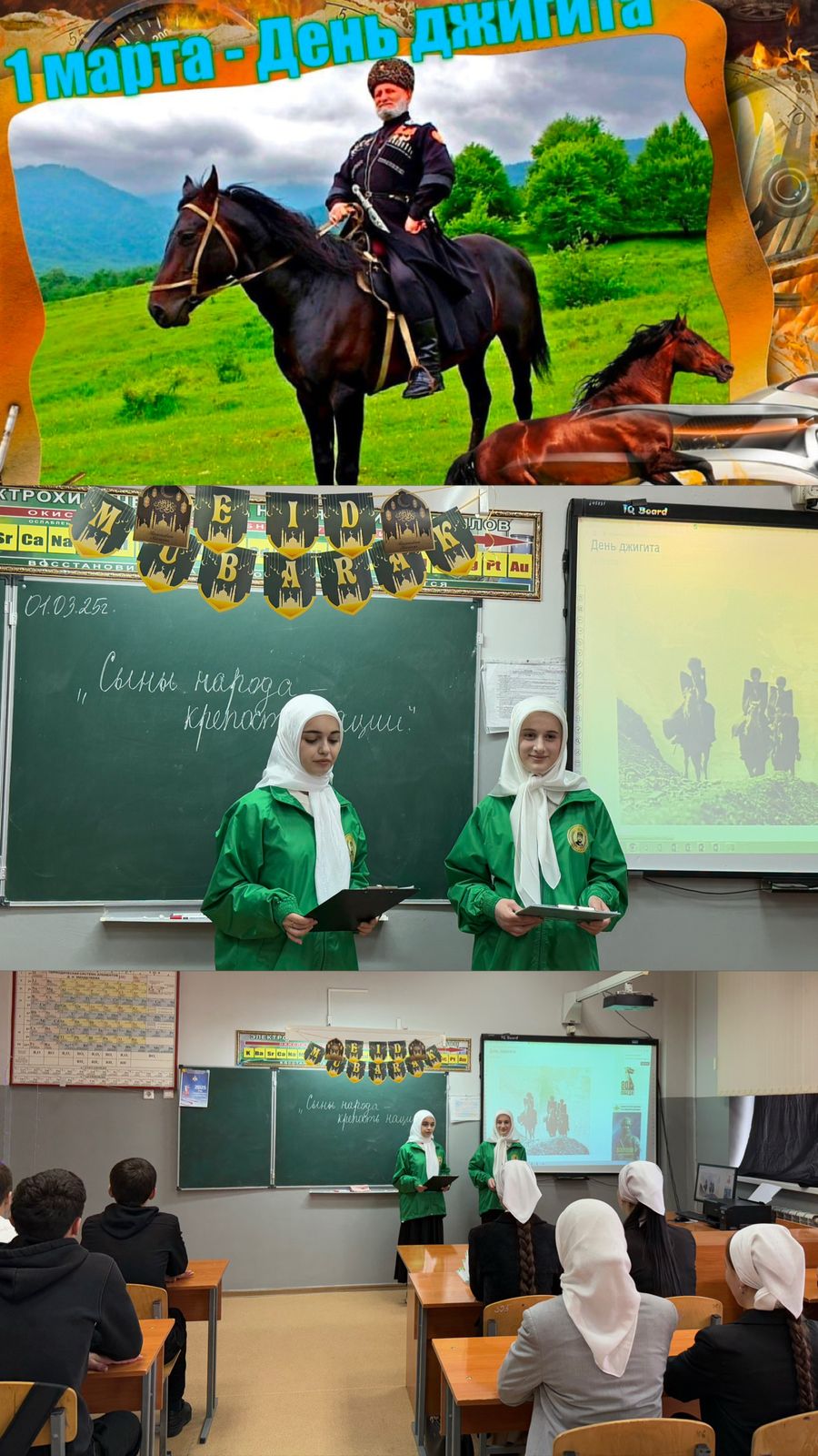 03.03.2025МБОУ «Ишхой-Юртовская СШ им.Абдулмежидова М.Д.» активисты ЧРОО ЕДЮО провели классный час на тему:«Сыны народа-крепость нации.»День джигита 1 марта ежегодно принято отмечать не только в Чечне. Празднуют его мужчины кавказских народностей, проживающие и в других странах мира.Джигит является олицетворением истинного мужества и патриотизма. И этот праздник призван подчеркнуть важность и значимость этих качеств, выразить огромное уважение и почет мужчинам - настоящим защитникам своей семьи и отечества.Цель: Познакомить детей с историей своей малой родины; сохранить и развить национальные традиции.